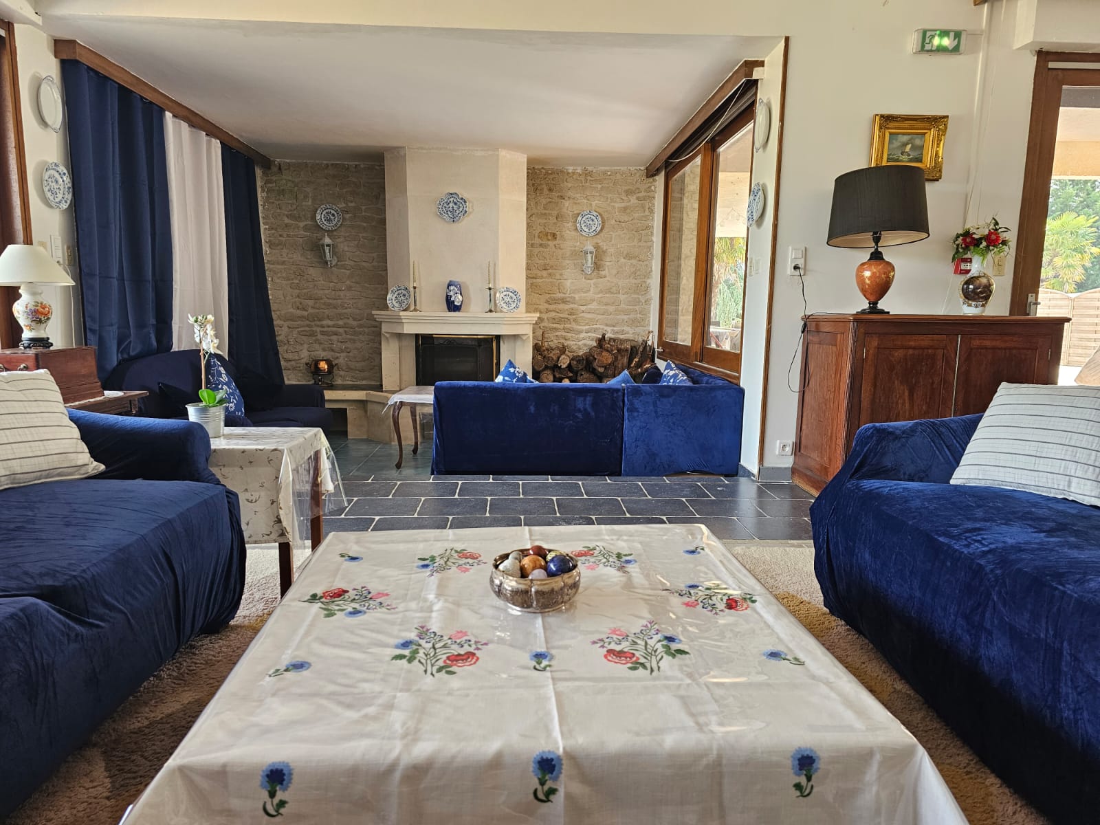 La salle est composée de trois salons avec canapés et tables basses, d'une salle à manger et d'un coin cheminée pour se retrouver chaleureusement autour d'un feu. Toute la pièce est encadrée de part et d'autre de grandes baies vitrées qui offrent une luminosité agréable et une vue imprenable sur le parc. De plus, les vitres peuvent être complètement ouvertes pour donner accès aux terrasses, permettant ainsi de profiter des espaces extérieurs et notamment d'un barbecue en pierre.